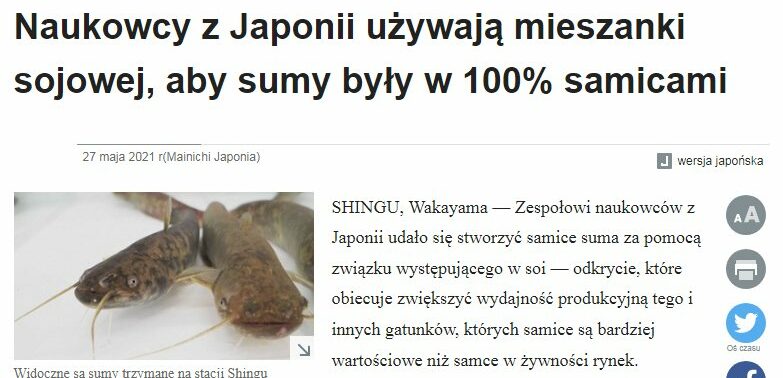 Fizjologiczna feminizacja osobników płci męskiej przy pomocy fitoestrogenów znajdujących się w pożywieniu roślinnym. SOJA SHINGU, Wakayama — Zespołowi naukowców z Japonii udało się stworzyć samice suma za pomocą związku występującego w soi — odkrycie, które obiecuje zwiększyć wydajność produkcyjną tego i innych...