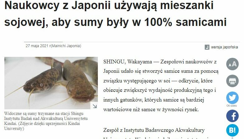 Zespół z Instytutu Badawczego Akwakultury Uniwersytetu Kindai z siedzibą w instytutowej stacji Shingu w Shingu w prefekturze Wakayama wykorzystał izoflawon – związek występujący w soi o działaniu podobnym do hormonów żeńskich – do stworzenia całkowicie żeńskich grup sumów. Według uniwersytetu jest to pierwszy wyczyn w Japonii.