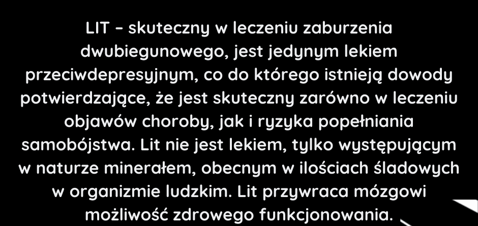 Dowiedziono, że długofalowe zażywanie litu zmniejsza liczbę samobójstw u osób z zaburzeniami psychicznymi – lit stabilizuje nastrój i uspokaja.